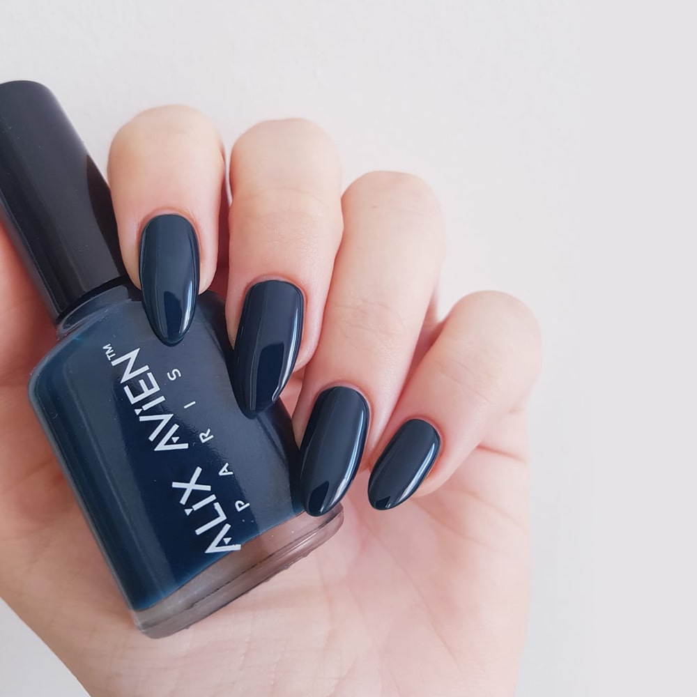 لون عميق وراقٍ: يضفي هذا الأزرق الداكن لمسة من القوة والأنوثة الغامضة على يديكِ، ويتناغم بشكل مذهل مع مختلف درجات البشرة.