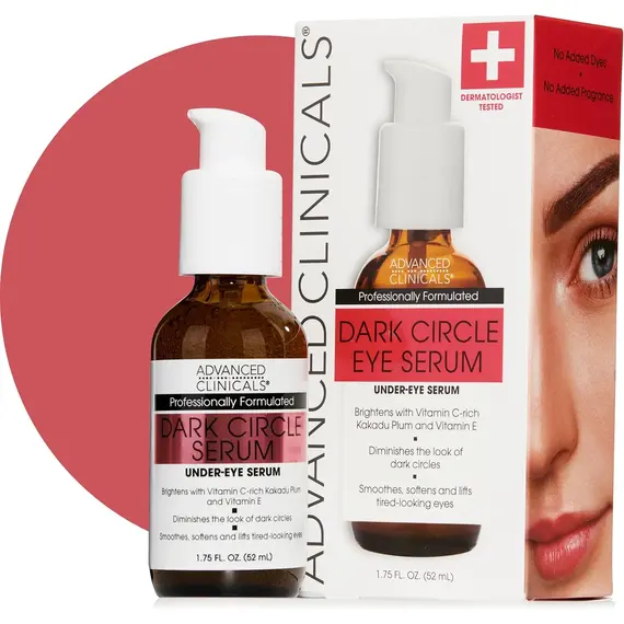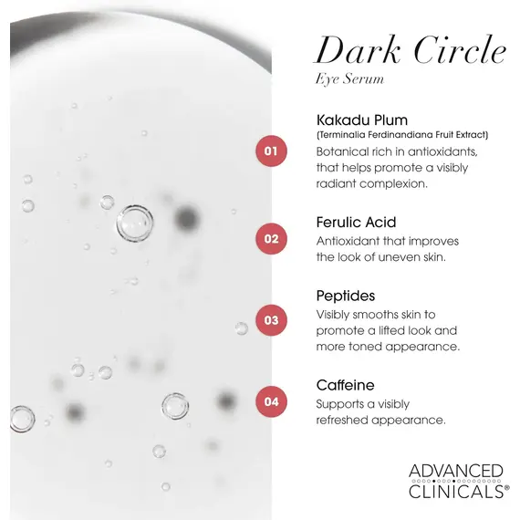 سيروم العين من Advanced Clinicals هو تركيبة احترافية مصممة خصيصًا لتقليل مظهر الهالات السوداء، الخطوط الدقيقة، وانتفاخات تحت العين. يحتوي على مزيج فعال من فيتامين C من فاكهة كاكادو بلوم، حمض الفيروليك، الببتيدات، والكافيين، مما يمنح البشرة حول العينين إشراقة، ترطيبًا، ومظهرًا مشدودًا وأكثر نضارة.