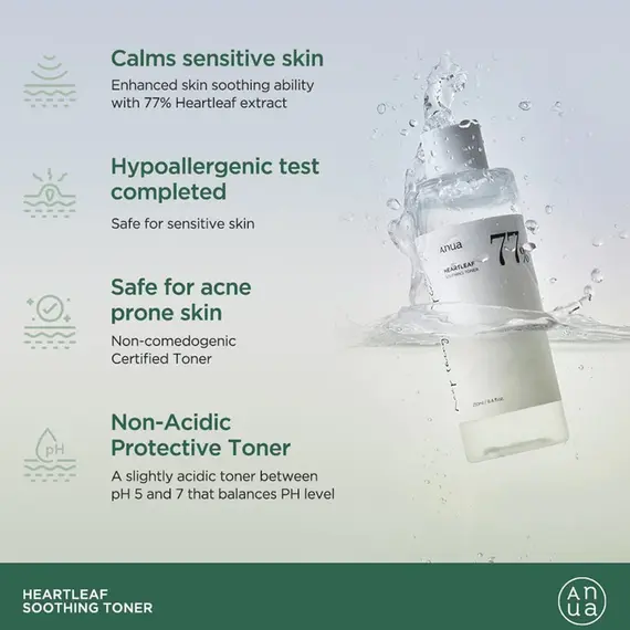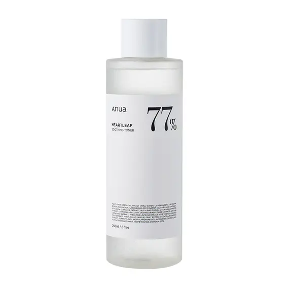 تونر Anua Heartleaf هو تركيبة نباتية مهدئة تحتوي على 77% من مستخلص أوراق القلب (Houttuynia Cordata)، المعروف بخصائصه المضادة للالتهاب والمهدئة للبشرة الحساسة. يتميز بتركيبة خفيفة ومتوازنة الحموضة (pH بين 5 و7)، مما يجعله مثاليًا للبشرة المعرضة للاحمرار، حب الشباب، أو التهيج.