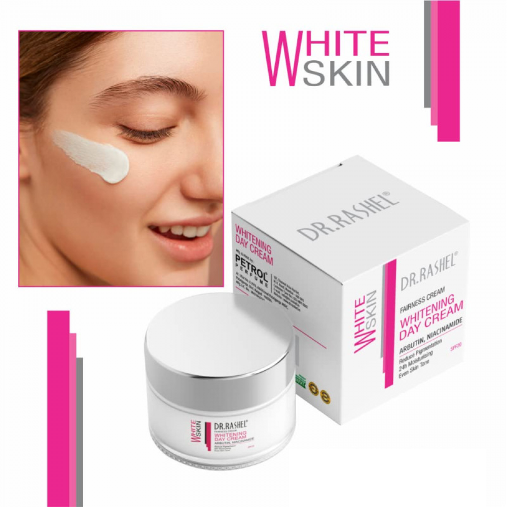 كريم النهار "د. راشيل" يحتوي على أربوتين ونياسيناميد، ويُروّج له بأنه يُقلل التصبغات، يُرطّب البشرة لمدة ٢٤ ساعة، ويُوحد لون البشرة. كما يوفر حماية من الشمس بعامل SPF 20.
