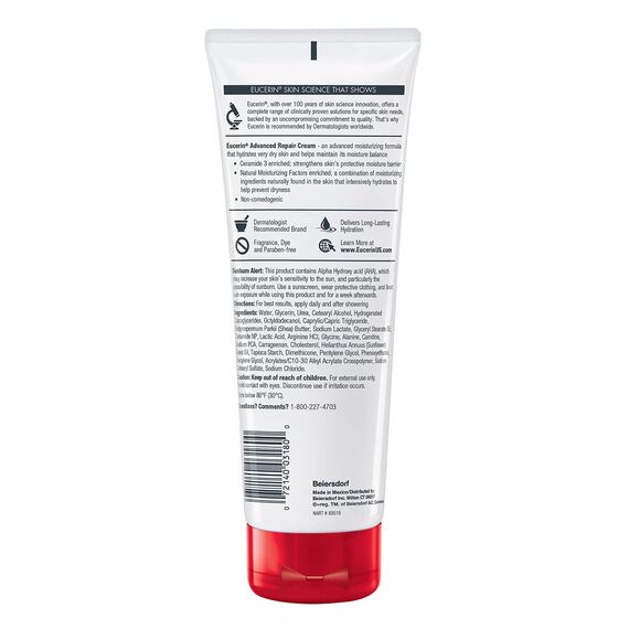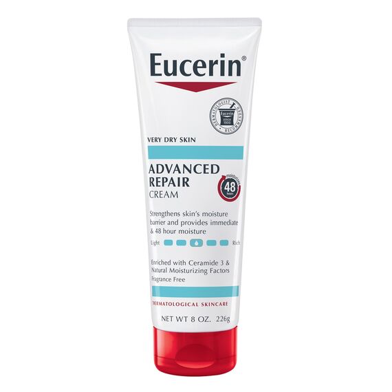 Eucerin Advanced Repair Cream is a dermatologist-recommended formula designed to deeply hydrate and restore very dry skin. Enriched with Ceramide 3 and Natural Moisturizing Factors (NMFs) like urea and glycerin, it strengthens the skin barrier and delivers immediate and 48-hour moisture. The rich texture is fragrance-free and ideal for sensitive skin.