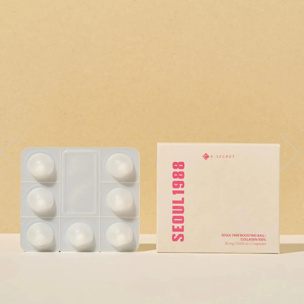 كبسولات SEOUL 1988 Boosting Ball هي علاج يومي مكثف للعناية بالبشرة، تحتوي على كولاجين نقي بنسبة 100% بتركيز 35 ملغ في كل كبسولة. مصممة لتُستخدم على مدار أسبوع كامل، حيث توفر كل كبسولة جرعة مركزة من الكولاجين لتعزيز مرونة البشرة، تقليل الخطوط الدقيقة، وتحسين الإشراقة العامة.