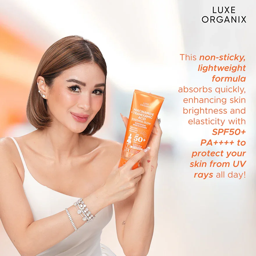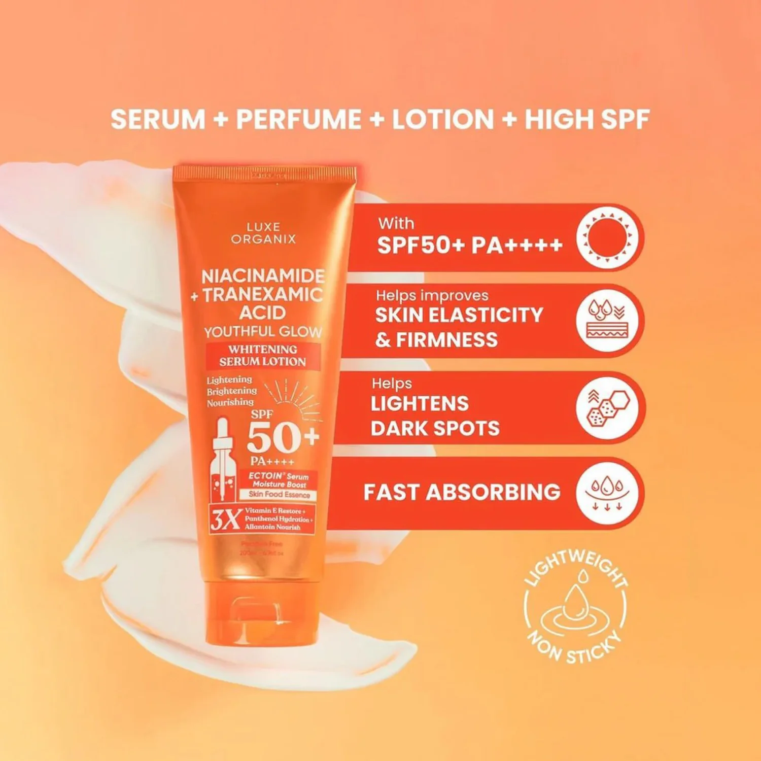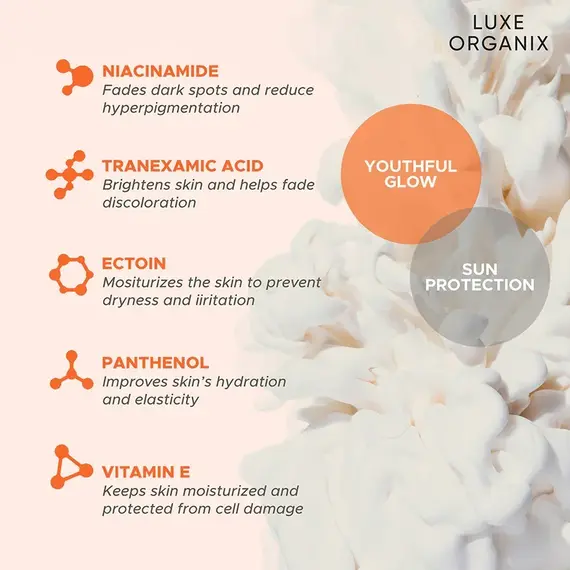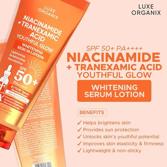 لوشن السيروم "Luxe Organix Youthful Glow" يجمع بين نياسيناميد وحمض الترانيكساميك لتفتيح البشرة وتقليل التصبغات، مع حماية فائقة من الشمس بفضل SPF 50+ PA++++. يحتوي على ECTOIN® لترطيب عميق، وفيتامين E، بانثينول، وألانتوين لتغذية وتجديد البشرة. تركيبته خفيفة، غير دهنية، وتمتص بسرعة.
