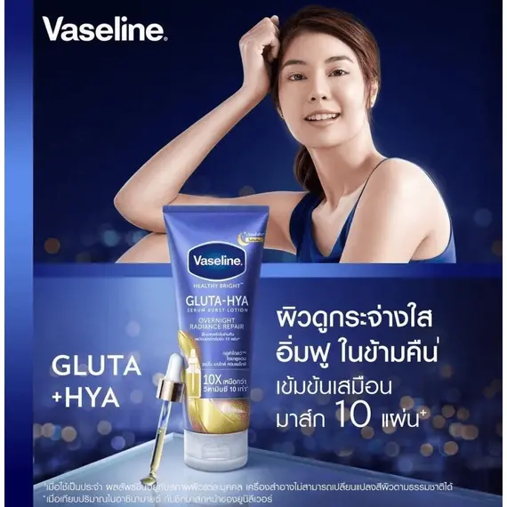 لوشن "Overnight Radiance Repair" من فازلين يحتوي على تركيبة مركزة من GlutaGlow™ وحمض الهيالورونيك، لتفتيح البشرة وتجديدها أثناء النوم. بتركيبة فعالة تعادل قوة 10 ماسكات، يمنح البشرة إشراقة واضحة وترطيبًا عميقًا بحلول الصباح، مع ملمس خفيف وسريع الامتصاص.