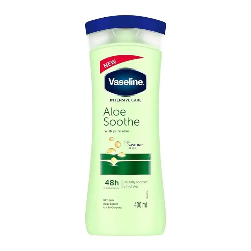 لوشن "Vaseline Aloe Soothe" يحتوي على جل الألوفيرا النقي وفازلين جيلي لترطيب البشرة الجافة وتهدئتها فورًا. تركيبته خفيفة وسريعة الامتصاص، تمنح البشرة راحة فورية وترطيبًا يدوم حتى ٤٨ ساعة.