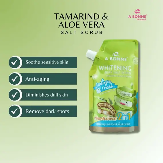 مقشر الملح الحريري المبيض A Bonne 2 في 1 بالتمر الهندي والألوفيرا (350 جرام) - تركيبة مُبردة ومنعشة بمركب النياسيناميد والأربوتين للتفتيح العميق وإزالة التصبغات