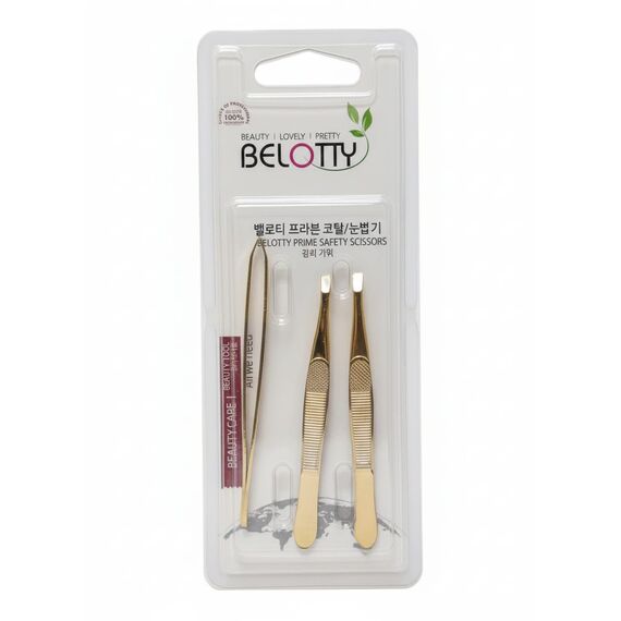 مجموعة احترافية من أدوات التجميل تشمل مقصين بأطراف دائرية وملاقط ذهبية، مصممة للعناية الدقيقة بالحواجب وشعر الأنف.