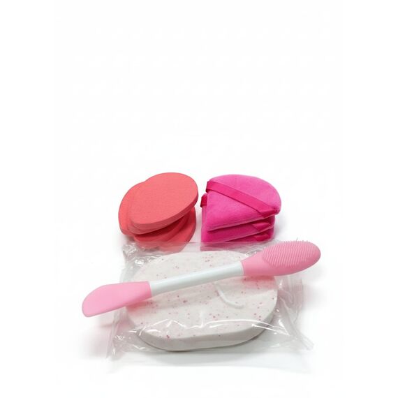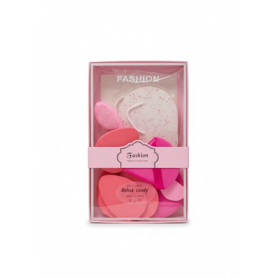 طقم إسفنجات تجميل من Bohsa Candy، يحتوي على مجموعة متنوعة من الإسفنجات بألوان وردية وحمراء، داخل عبوة عرض شفافة أنيقة.