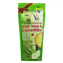 المنتج: YC Aloe Vera & Cucumber Spa Salt (ملح سبا بالصبار والخيار من YC). التركيز/المكون النشط: الصبار (الألوفيرا) والخيار (Aloe Vera & Cucumber) . الوظائف (4 في 1): أربع فوائد رئيسية (4 in 1). الوزن الصافي: 300 جرام (NET WT. 300g) . العبوة: مزودة بسحاب للإغلاق (Zip Locker). الفوائد الرئيسية المذكورة بالإنجليزية (4 في 1): إنعاش البشرة (Skin Refreshing) . خصائص مُهدئة ومُلطفة (Soothing & Calm Properties) . بشرة مُبيضة ومُشرقة (Whiten & Radiant Skin) . إزالة الأوساخ وخلايا الجلد الميتة (Remove dirt, dead skin cells) .