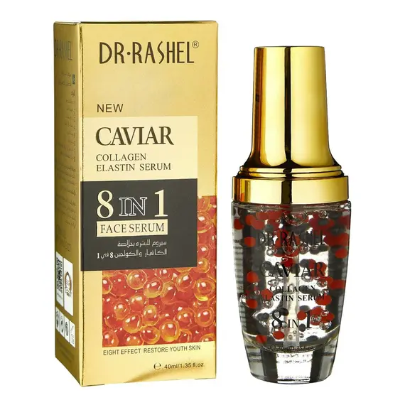 سيروم فاخر يحتوي على خلاصة الكافيار، الكولاجين، والإيلاستين، ويُروّج له بأنه يُعيد شباب البشرة من خلال ٨ تأثيرات فعالة. يُظهر المنتج كرات حمراء دقيقة معلقة داخل السيروم، مما يعزز مظهره الفاخر.