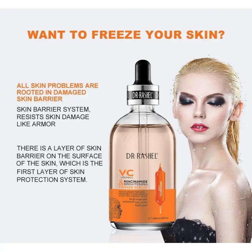 سيروم "د. راشيل" يحتوي على فيتامين سي + نياسيناميد، ويُروّج له بأنه يُرطّب البشرة، يُحضّرها للمكياج، ويمنحها إشراقة طبيعية. يُستخدم كبرايمر يومي أو كخطوة ترطيب خفيفة.