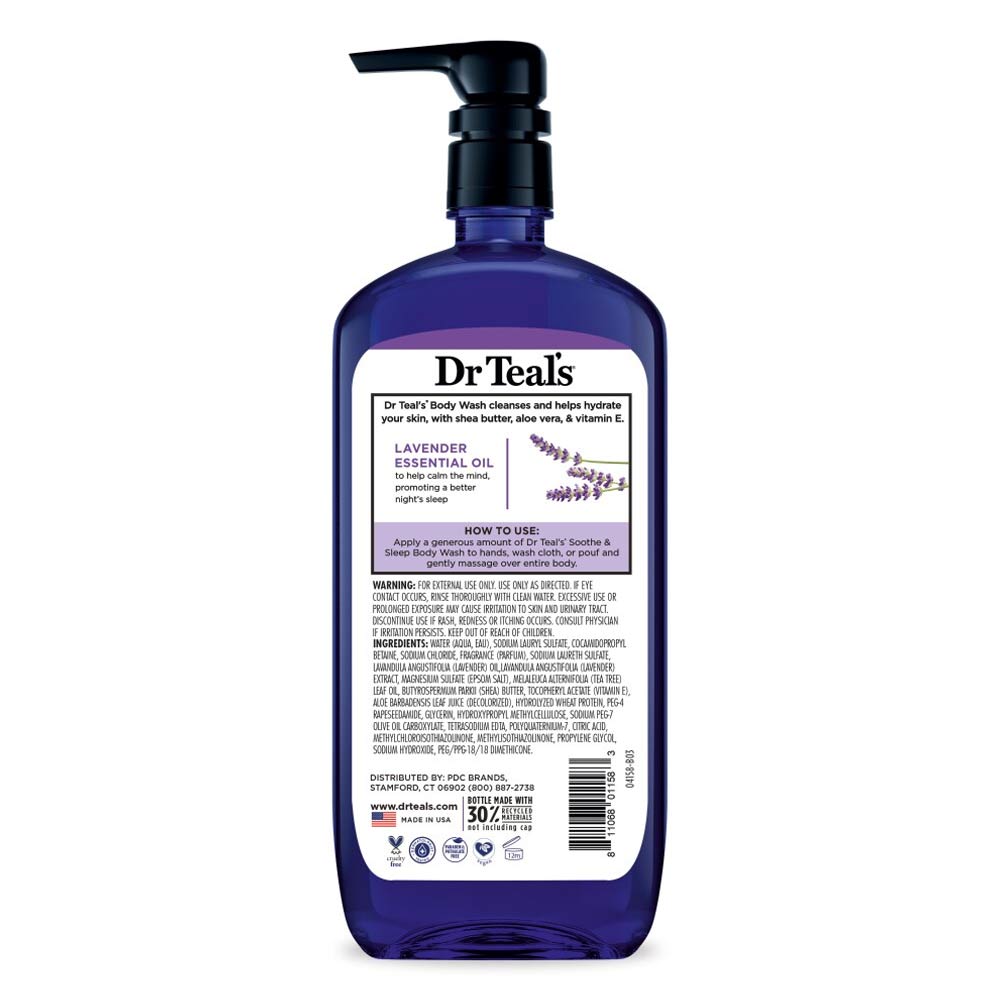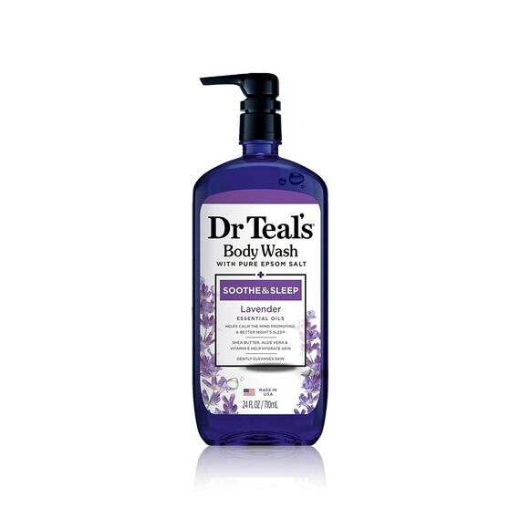 غسول الجسم "Dr Teal’s Soothe & Sleep" يحتوي على ملح إبسوم النقي وزيت اللافندر العطري لتهدئة العقل والجسم، مما يساعد على الاسترخاء والنوم الهادئ. غني بـ زبدة الشيا، الألوفيرا، وفيتامين E لترطيب البشرة بلطف وتنظيفها بفعالية دون تجفيف.