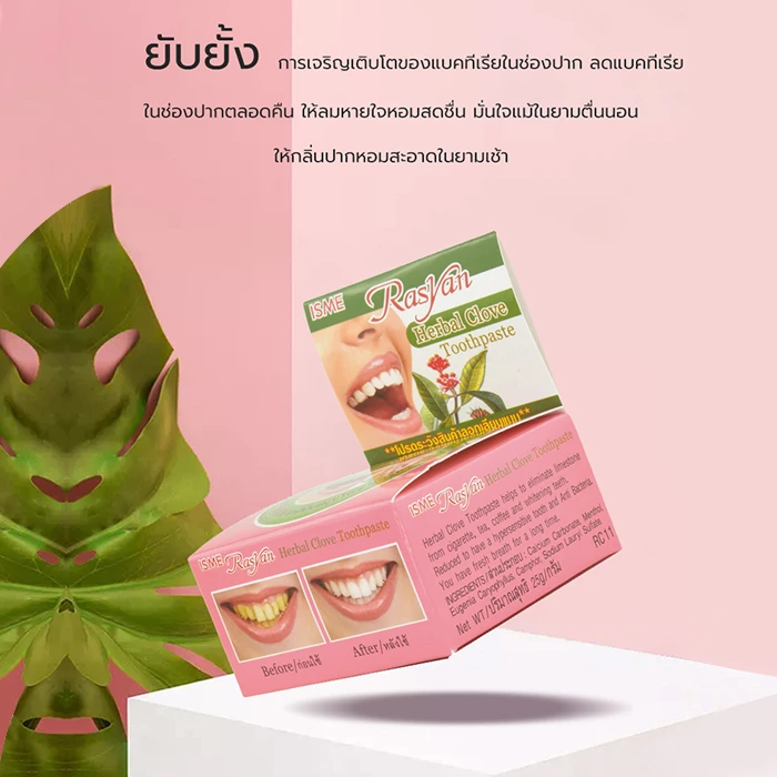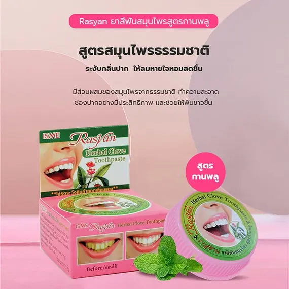 معجون "راسيان" العشبي يأتي في عبوة دائرية صغيرة، ويحتوي على مزيج طبيعي من القرنفل، الصبار، وأوراق الجوافة. يُروّج له بأنه يُنظّف الأسنان بعمق، يُقوّي اللثة، ويُنعش رائحة الفم، مع تأثير مبيّض تدريجي.