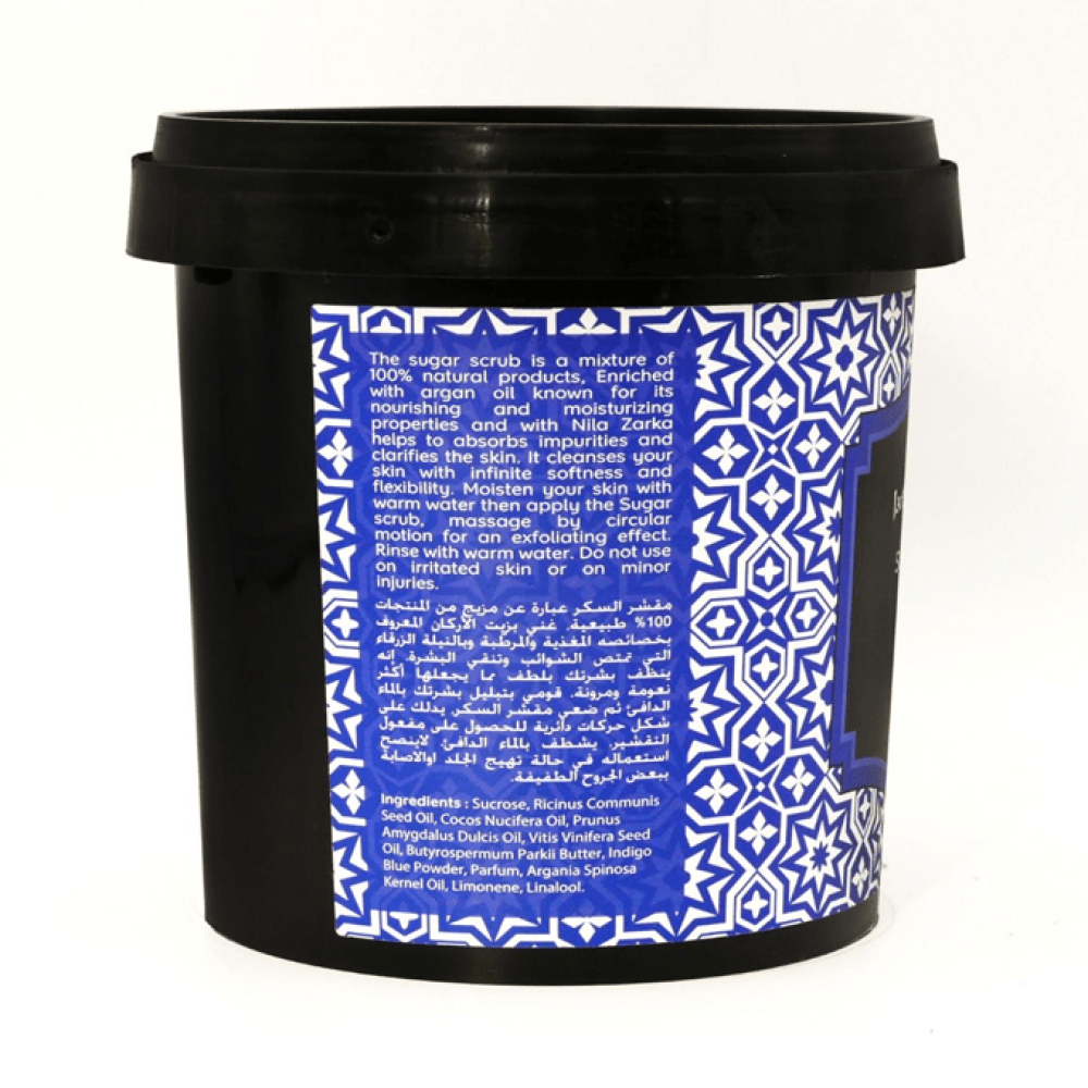 ضعي كمية كافية من مقشر السكر بالنيلة الزرقاء على جسمكِ.