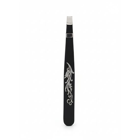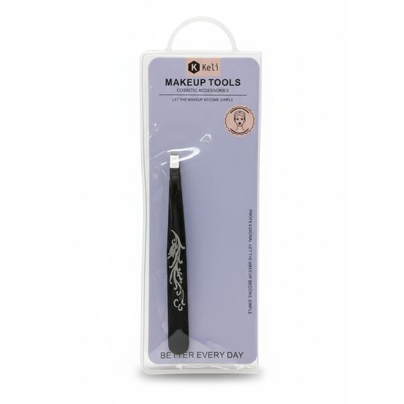 ملقط "كيلي" يُروّج كأداة دقيقة للعناية بالجمال، يأتي بتصميم معدني باللون الأسود مزخرف بنقشة فضية أنيقة على المقبض. العبوة البنفسجية تحمل رسومات أنثوية وشعار "اجعل المكياج بسيطًا"، مما يعزز الطابع العملي والراقي للمنتج.