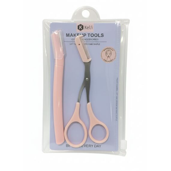 مجموعة "كيلي" تُروّج كأدوات تجميلية للعناية بالحواجب، تحتوي على مقص وردي مزود بمشط مدمج، بالإضافة إلى شفرة حواجب وردية. العبوة البنفسجية تحمل رسومات أنثوية وشعار "اجعل الجمال بسيطًا"، مما يعزز الطابع العملي واللطيف للمنتج.