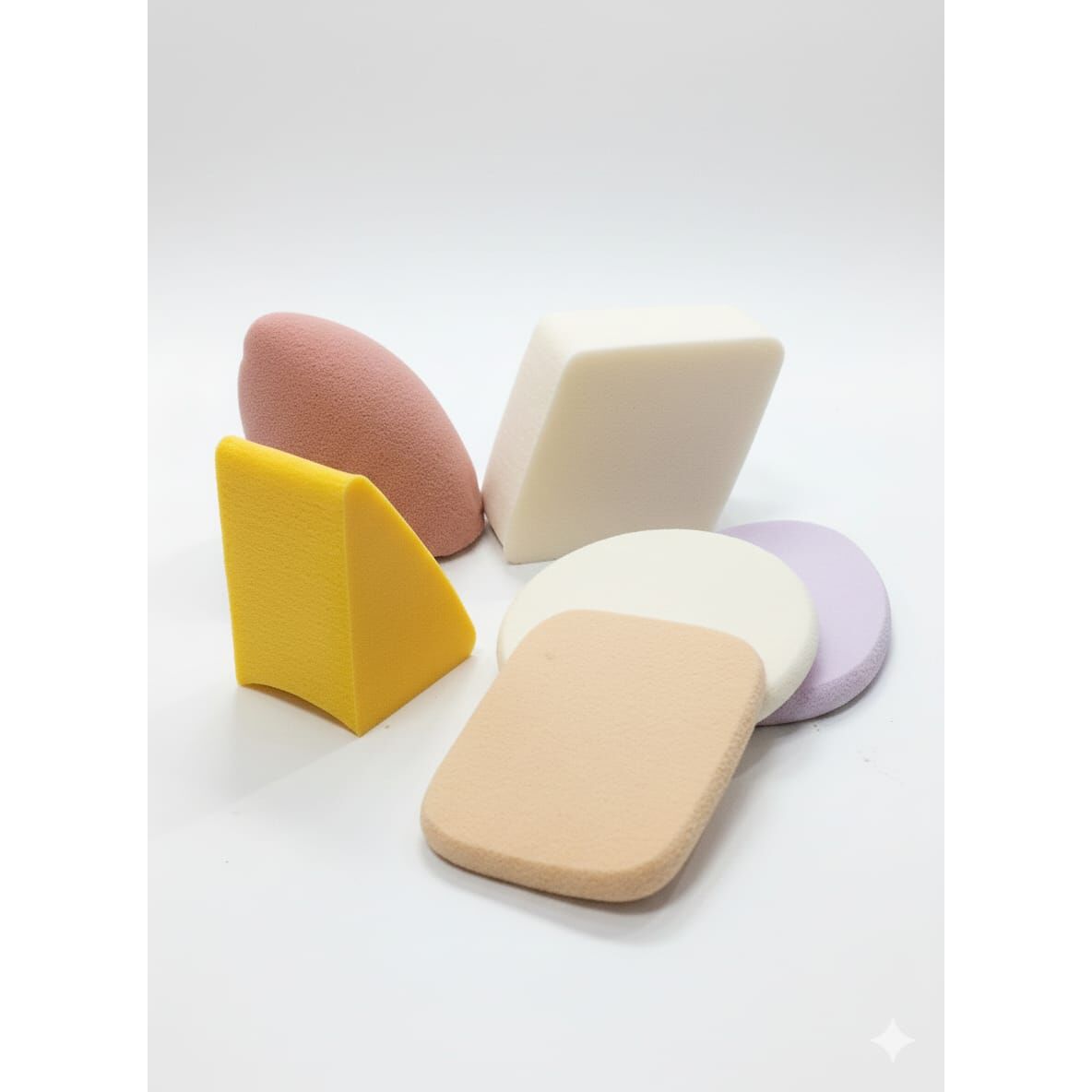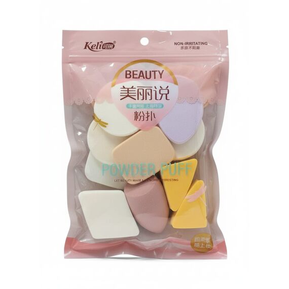 مجموعة إسفنجات تجميل من Keli بأشكال متنوعة (دائري، مستطيل، قطرة) وألوان باستيلية جذابة.