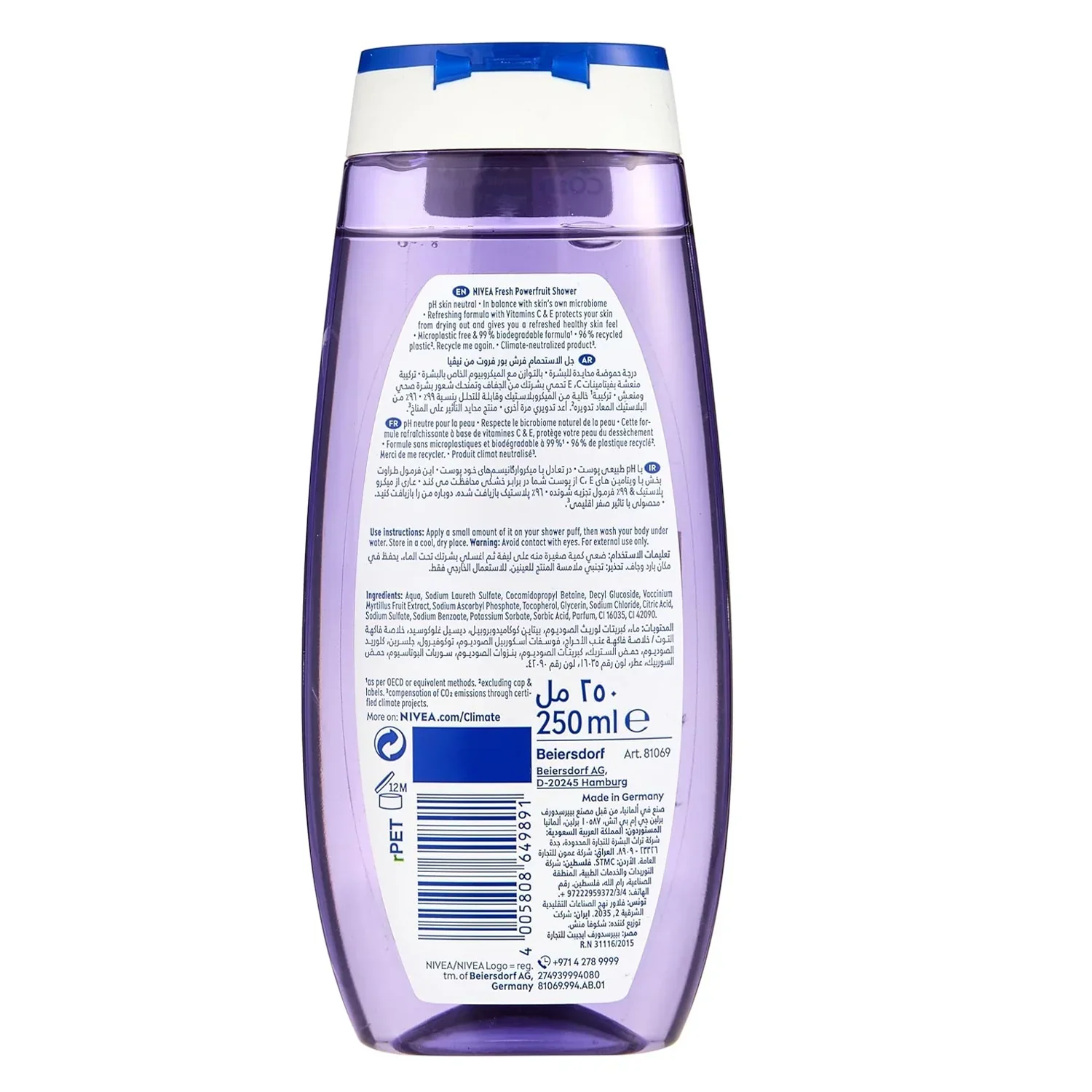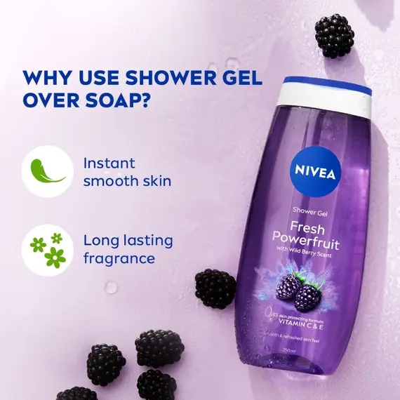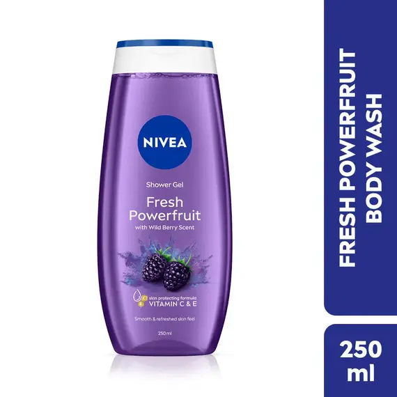 جل الاستحمام "NIVEA Powerfruit" يحتوي على تركيبة منعشة غنية بـ فيتامين C وE، مع رائحة التوت البري الجذابة. ينظف البشرة بلطف ويمنحها إحساسًا بالحيوية والنعومة الفورية، مع تركيبة تحمي البشرة من الجفاف وتدعم نضارتها الطبيعية.