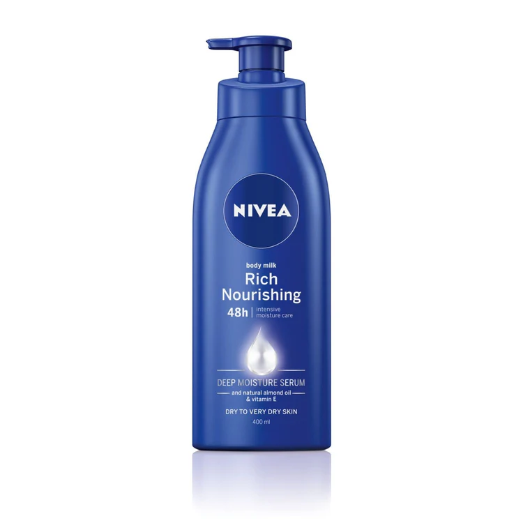 ميلك الجسم "NIVEA Rich Nourishing" مصمم خصيصًا للبشرة الجافة جدًا، ويحتوي على تركيبة Deep Moisture Serum مع زيت اللوز الطبيعي وفيتامين E لتوفير ترطيب مكثف يدوم حتى ٤٨ ساعة. يمنح البشرة نعومة فورية ويعيد لها مرونتها الطبيعية.