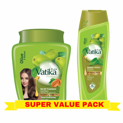 المنتج: حزمة قيمة فائقة (SUPER VALUE PACK) .   البراند: فاتيكا ناتشورالز (Vatika Naturals) .   التركيبة الأساسية: زيتون ولوز (Olive & Almond).   الوظيفة: تغذية وحماية (Nourish & Protect) للشعر.   محتويات الحزمة (الأحجام المصححة): حمام زيت / علاج الزيت الساخن (Hot Oil Treatment / Deep Conditioning): 1 كجم (Deep Conditioning). شامبو (Shampoo / Nourish & Protect): 200 مل .