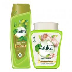المنتج: حزمة عناية مزدوجة (Super Value Pack) . البراند: فاتيكا ناتشورالز (Vatika Naturals) . محتويات الحزمة وتركيزها (بالأحجام المصححة): شامبو (Shampoo / Nourish & Protect) - 200 مل: بتركيبة الزيتون والأعشاب (Olive & Herbs) . يركز على التغذية والحماية للشعر العادي (For Normal Hair). حمام زيت / علاج الزيت الساخن (Hot Oil Treatment) - 1 كجم: بتركيبة الثوم (Garlic) . يركز على تحفيز نمو الشعر الطبيعي (Promotes Natural Hair Growth) . ملاحظة هامة (الشامبو): بدون سلفات، بدون بارابين، بدون كحول (NO SULPHATES, NO PARABENS, NO ALCOHOL). ملاحظة هامة (حمام الزيت): مع زيوت فاتيكا المغذية (With Nourishing Vatika Oils).
