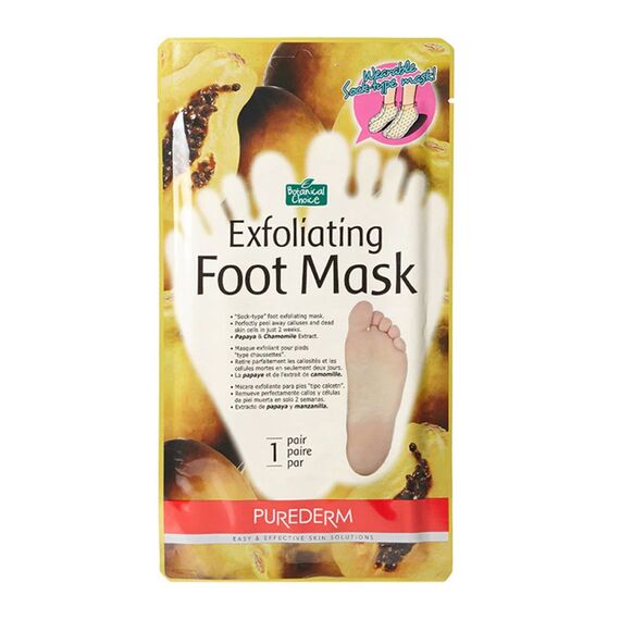 امنحي قدميك علاج سبا متكاملاً في المنزل مع قناع تقشير القدمين (Exfoliating Foot Mask) من بيور ديرم. هذا القناع المصمم على شكل جورب (Sock-type) يعمل بفعالية على إزالة الجلد الميت ومسمار القدم (الكالو) بالكامل في غضون أسبوعين فقط.