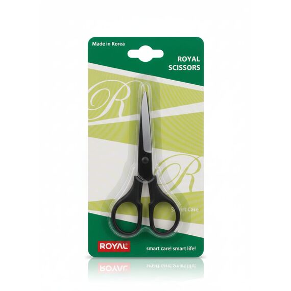 مقص احترافي من رويال، مصنوع من الفولاذ المقاوم للصدأ، ويتميز بمقابض سوداء مريحة.