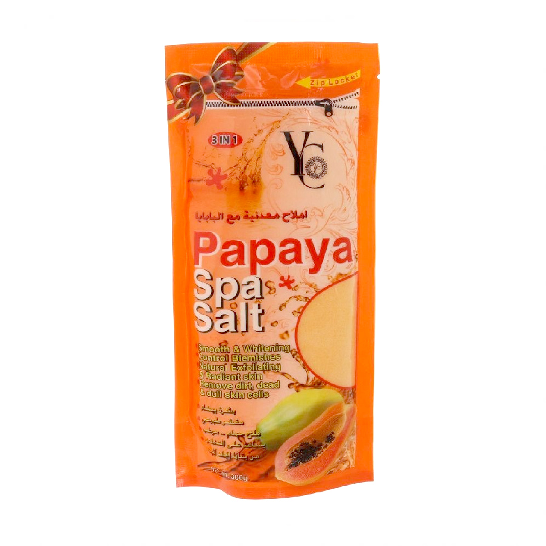 ملح سبا YC بالبابايا 3 في 1 (300 جرام) - مقشر طبيعي لتنعيم وتبييض البشرة، تحكم في الشوائب وإزالة الجلد الميت والأوساخ