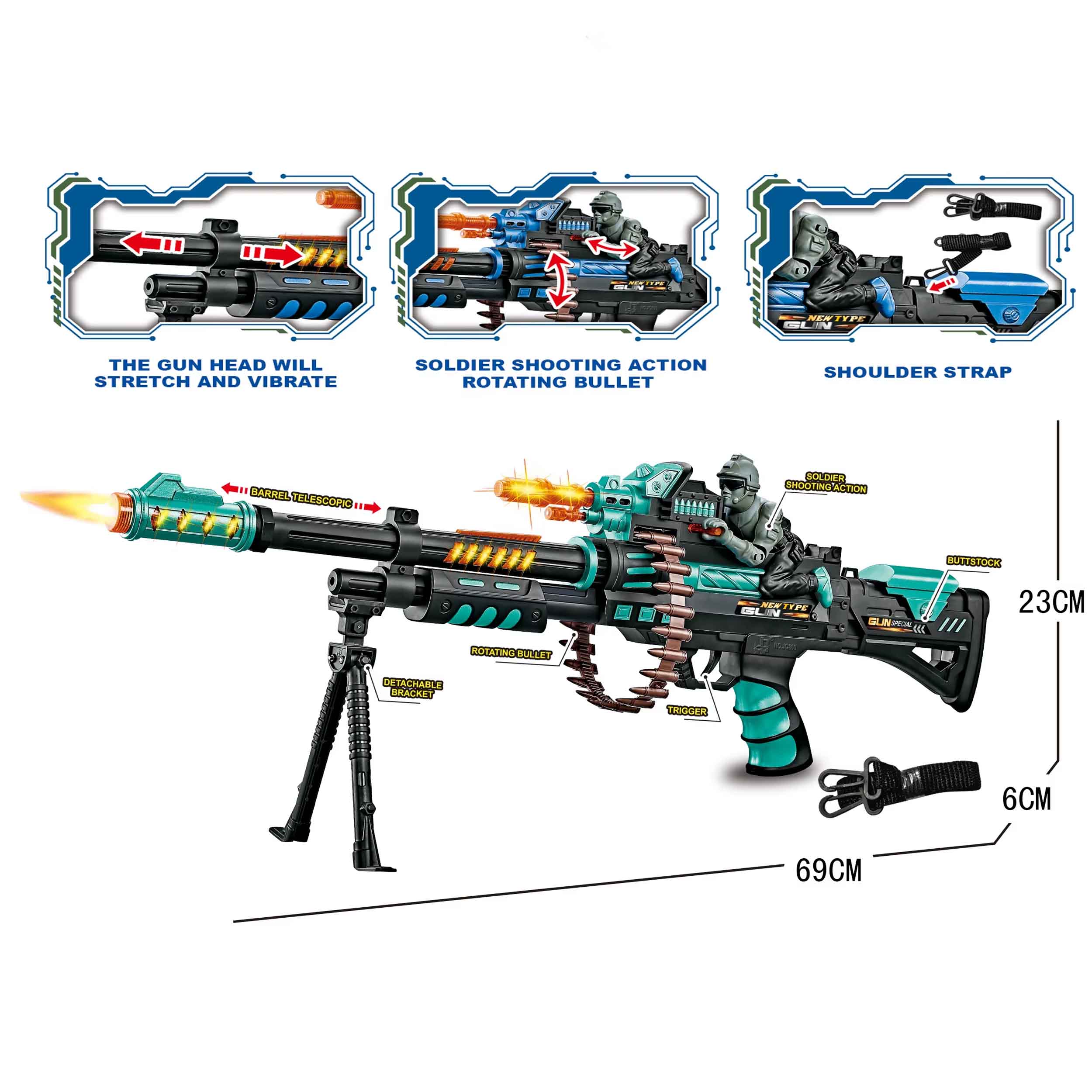 حركة الجندي: يوجد مجسم صغير لجندي أعلى السلاح يتحرك وكأنه يصوّب ويطلق النار.