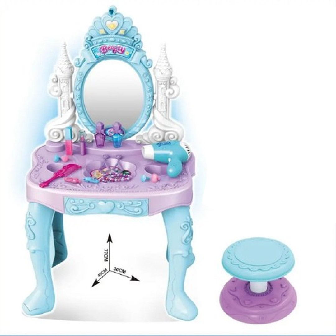 • مقعد مخصص: تتضمن المجموعة كرسياً دائرياً متناسقاً مع الطاولة، لتمكين الطفلة من الجلوس براحة أمام المرآة أثناء التزيين.