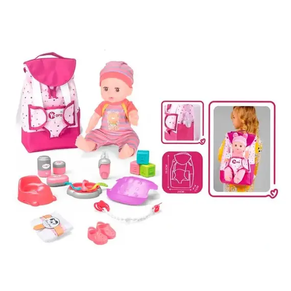 • حقيبة ظهر للحمل: تأتي المجموعة مع شنطة ظهر قماشية أنيقة بنقاط وردية، مصممة خصيصاً لتوضع الدمية بداخلها وتحملها الطفلة على ظهرها بسهولة.
