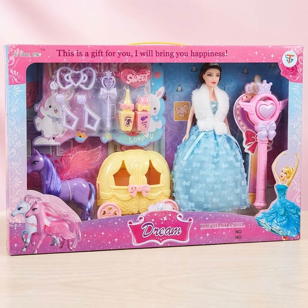 انقل طفلتك إلى عالم ساحر من الخيال مع مجموعة "Dream" المتميزة. تحمل هذه المجموعة رسالة دافئة على العبوة: "هذه هدية لك، سأجلب لك السعادة"، مما يجعلها خياراً مثالياً للهدايا. تتضمن المجموعة دمية أميرة أنيقة ترتدي فستاناً أزرق فاخراً مع وشاح من الفرو الأبيض، ترافقها عربة ملكية وحصان مجنح (بيغاسوس) بألوان خيالية، بالإضافة إلى عصا سحرية كبيرة وإكسسوارات متنوعة لتكتمل القصة الخيالية.
