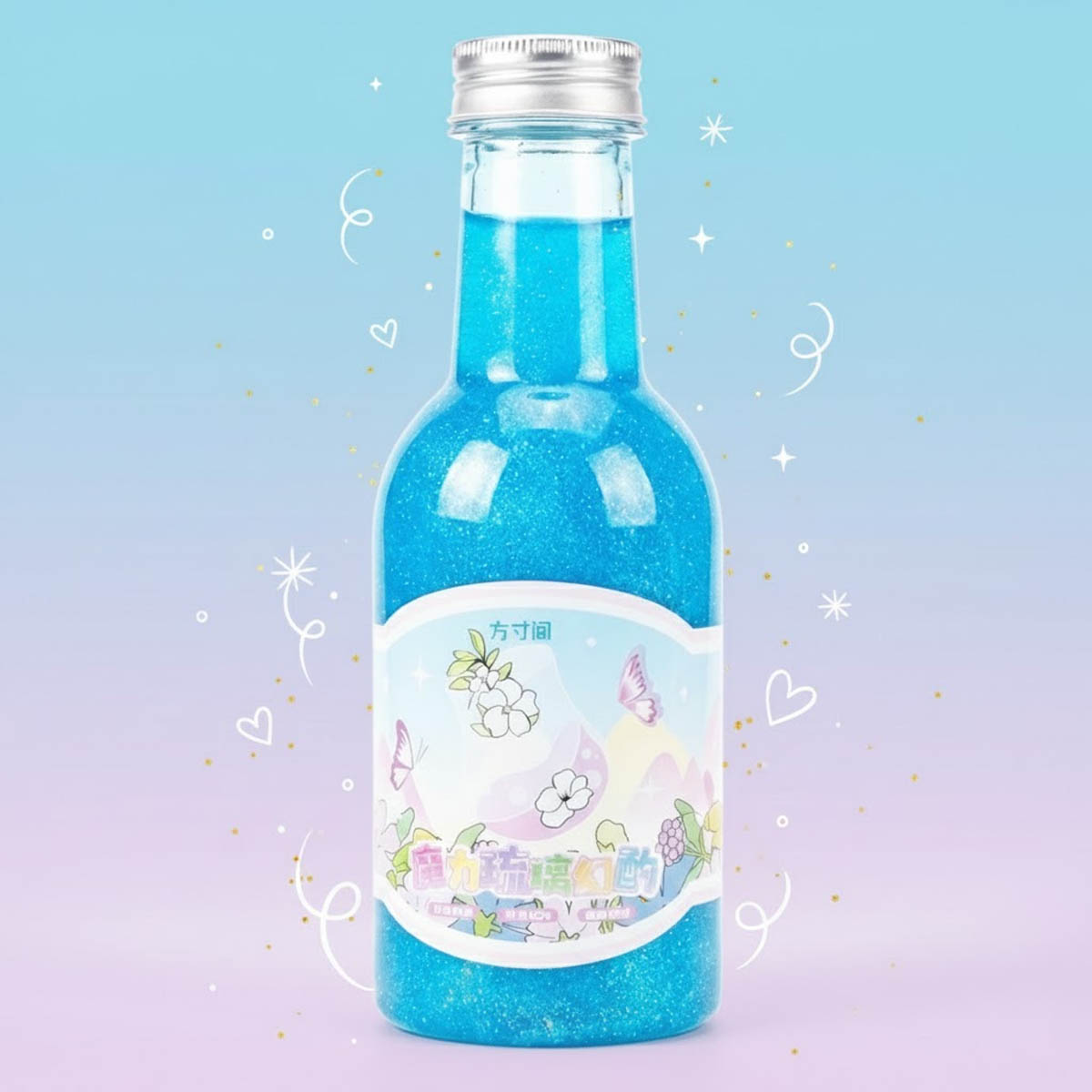 • تصميم عبوة فني: محفوظ داخل عبوة شفافة عالية الجودة تظهر جمال السلايم، وعليها ملصق بتصميم خيالي يحمل رسومات لفراشات وزهور بألوان الباستيل الهادئة.