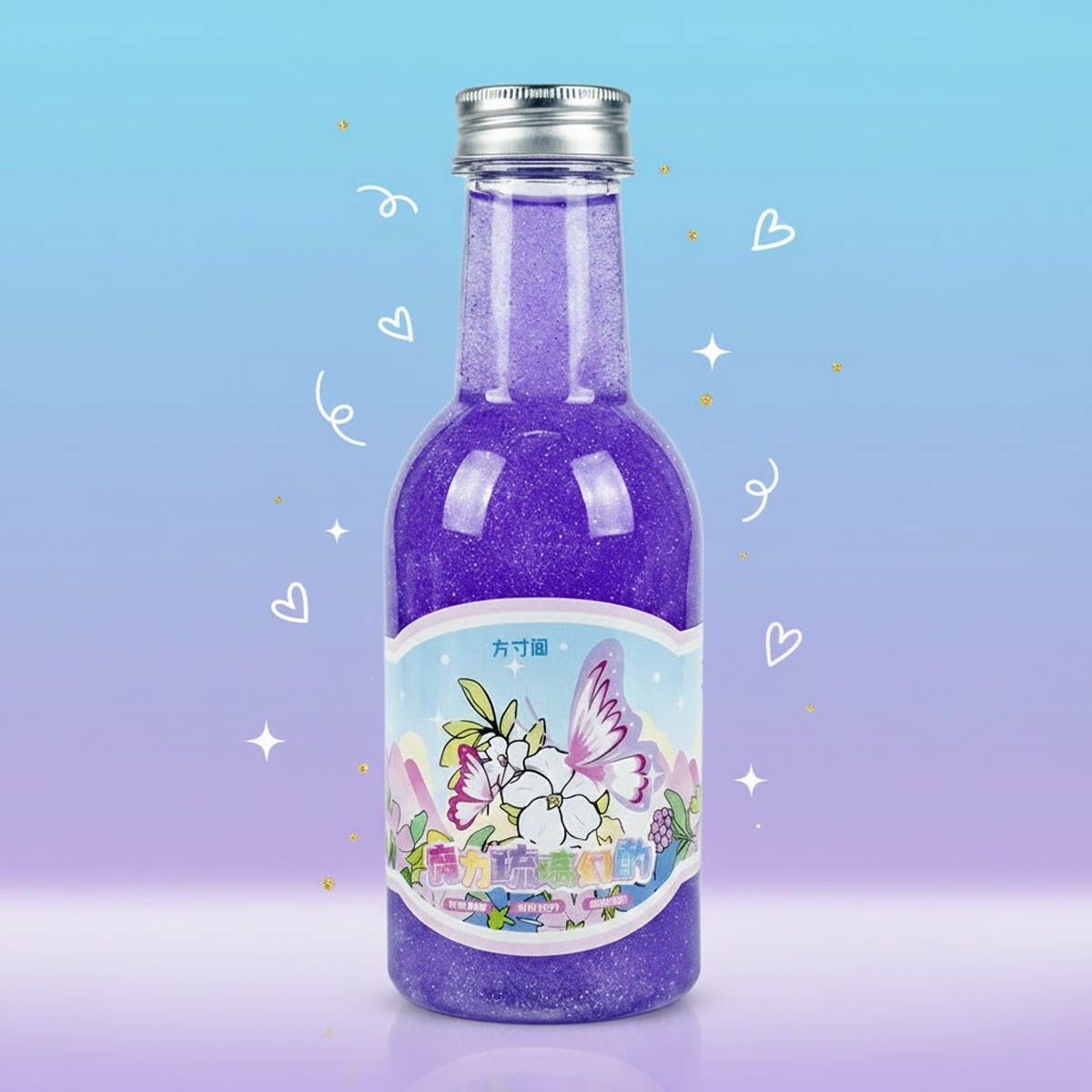 • تصميم عبوة فني: محفوظ داخل عبوة شفافة عالية الجودة تظهر جمال السلايم، وعليها ملصق بتصميم خيالي يحمل رسومات لفراشات وزهور بألوان الباستيل الهادئة.