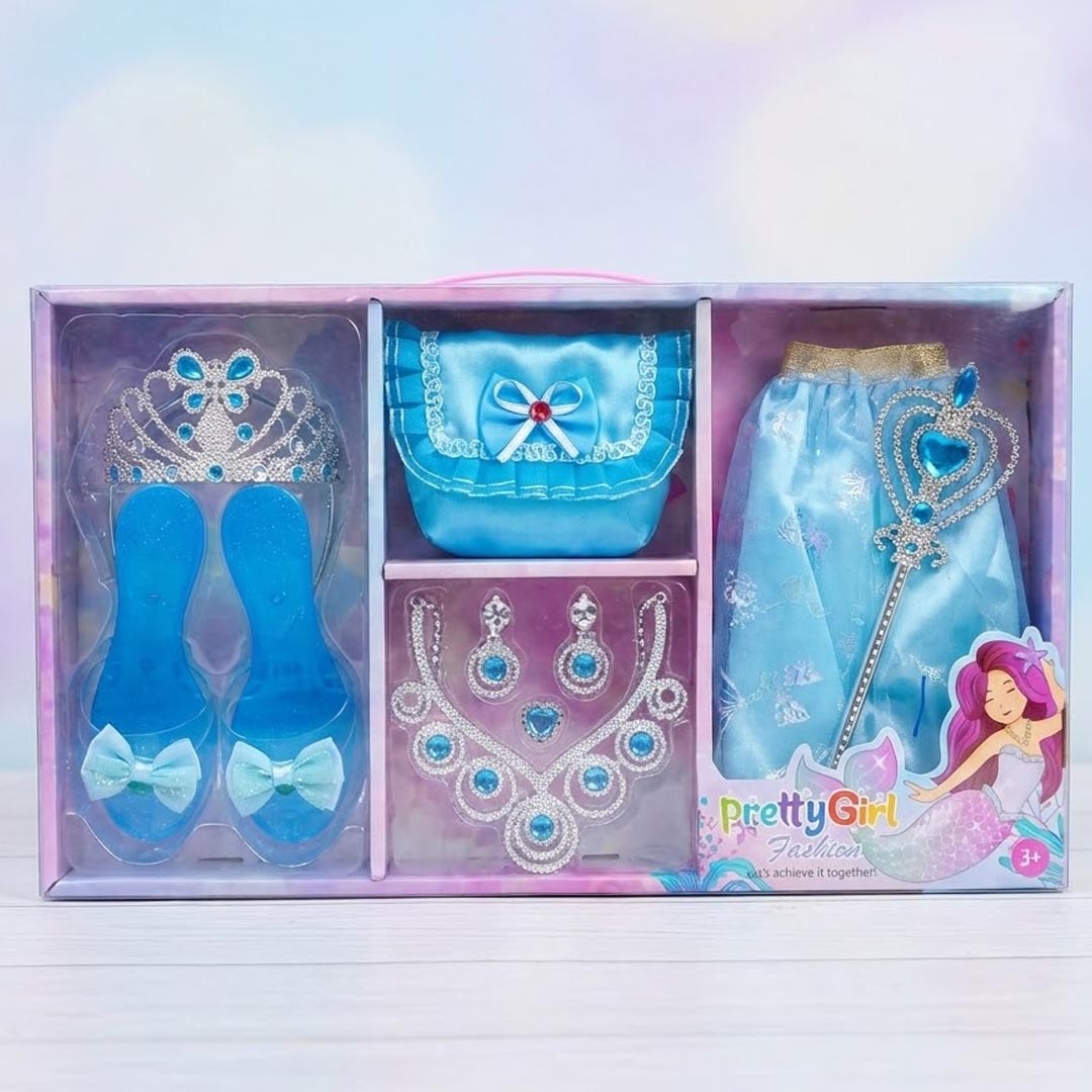 امنحي طفلتك إطلالة الأميرات الساحرة مع مجموعة "Pretty Girl Fashion" باللون الأزرق السماوي. تستوحي هذه المجموعة تصميمها من عالم حوريات البحر، لتقدم تجربة تنكرية متكاملة تجمع بين الأناقة والمرح. تحتوي العبوة على تشكيلة فاخرة من الإكسسوارات والمجوهرات والحلي المتناسقة، مما يتيح للطفلة تقمص دور أميرة البحار في الحفلات أو أثناء اللعب اليومي، مع تعزيز خيالها وثقتها بنفسها.