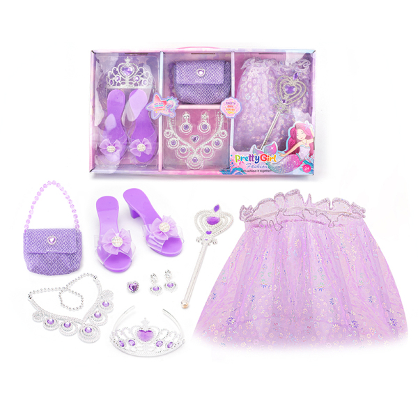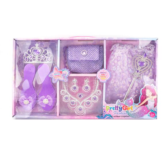 أضيفي لمسة من السحر والأناقة إلى خزانة طفلتك مع مجموعة "Pretty Girl Fashion" المتميزة. تستوحي هذه المجموعة تصميمها من عالم حوريات البحر الخيالي، حيث يطغى عليها اللون البنفسجي الجذاب مع تفاصيل لامعة. تتضمن العبوة طقماً متكاملاً يتيح للطفلة تنسيق مظهرها بالكامل، بدءاً من التنورة التول الفاخرة وصولاً إلى الحذاء والمجوهرات، مما يجعلها الخيار الأمثل للحفلات ولعب الأدوار التخيلي.