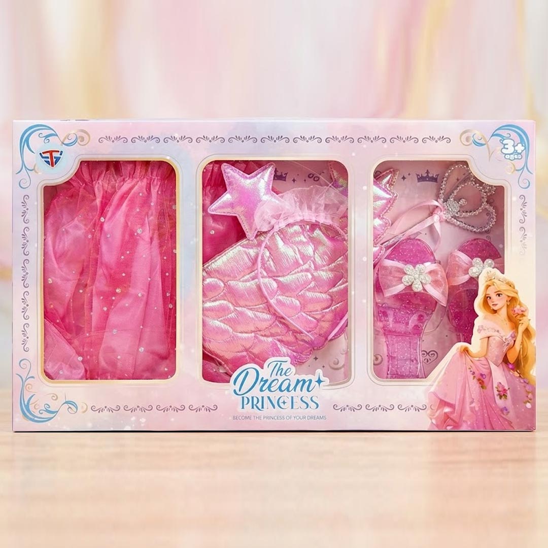 طقم تنكري شامل: تحتوي العبوة على ثلاثة أقسام تعرض تشكيلة كاملة من مستلزمات الأميرة، مما يوفر تجربة تحول كاملة للطفلة.