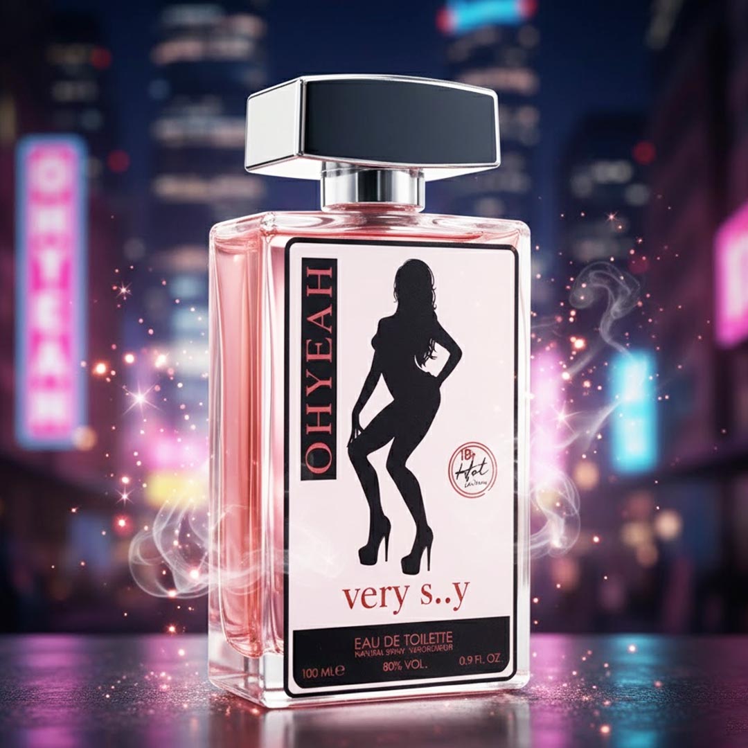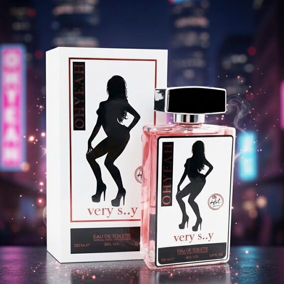 عطر "OHYEAH Very S..y" يُروّج له بأنه أو دو تواليت جريء للبالغين، ويتميز بتصميم لافت وسائل وردي داخل زجاجة شفافة. العبوة تحمل عبارة "18+ Hot Line"، مما يدل على أنه مخصص لفئة عمرية محددة.