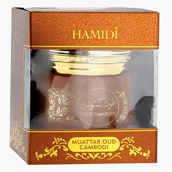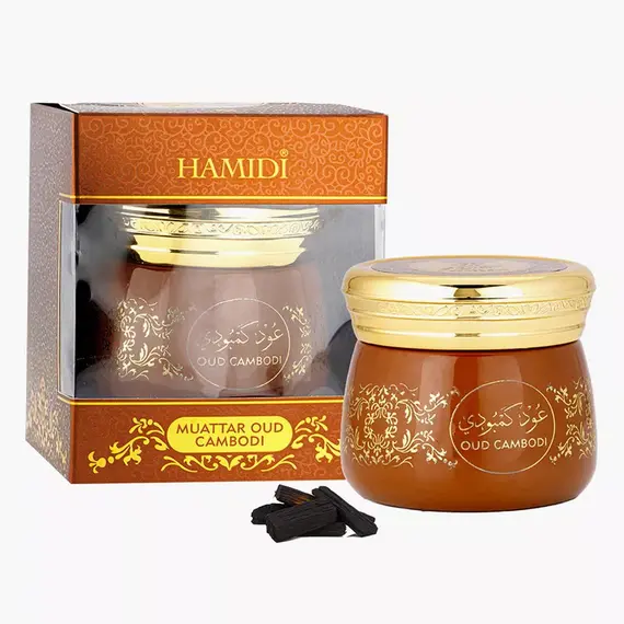 بخور عود كمبودي من حميدي هو مزيج فاخر من رقائق العود الكمبودي والزيوت العطرية الشرقية، يأتي في عبوة بنية أنيقة مزخرفة بلمسات ذهبية فاخرة.