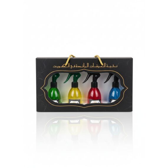 مجموعة رشاشات متعددة الاستخدامات تُروّج بأنها من "النخبة الرائجة في الكويت"، وتأتي في علبة سوداء أنيقة بواجهة شفافة وحدود ذهبية، مع مقبض حبل فاخر. تحتوي المجموعة على أربع عبوات بألوان مختلفة (أخضر، أصفر، أحمر، أزرق)، مما يوحي بتنوع الروائح أو الوظائف.