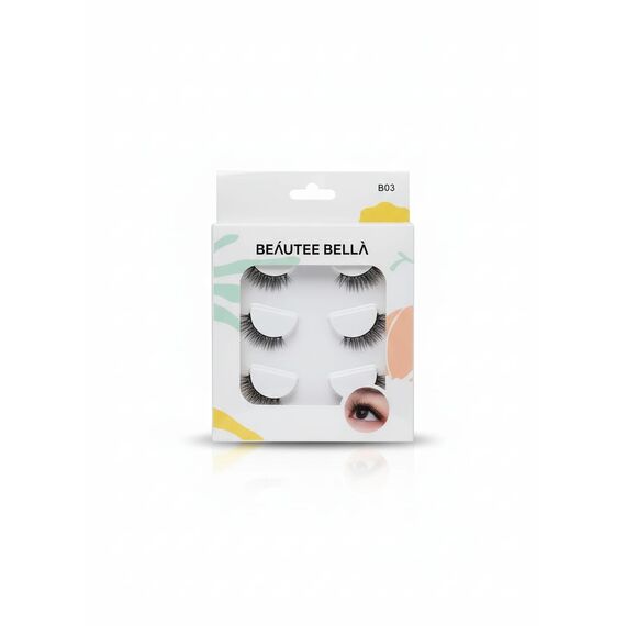 Beautée Bellà’s professional lash set – Style B03 – includes four pairs of handmade lashes crafted from genuine horse hair. They offer a voluminous, feminine look with natural softness. The balanced design enhances eye definition and suits all eye shapes, making them ideal for both everyday wear and special occasions.