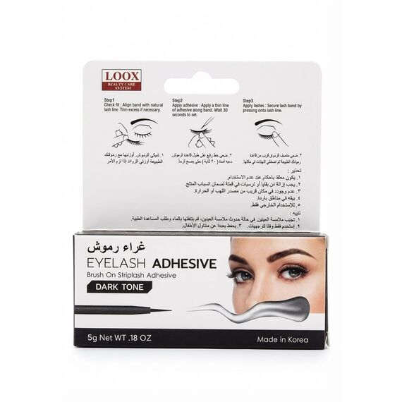 لاصق رموش احترافي بلون داكن، يجف بلون يندمج مع الرموش السوداء أو البنية، ويُوفر تثبيتًا قويًا ومقاومًا للماء.