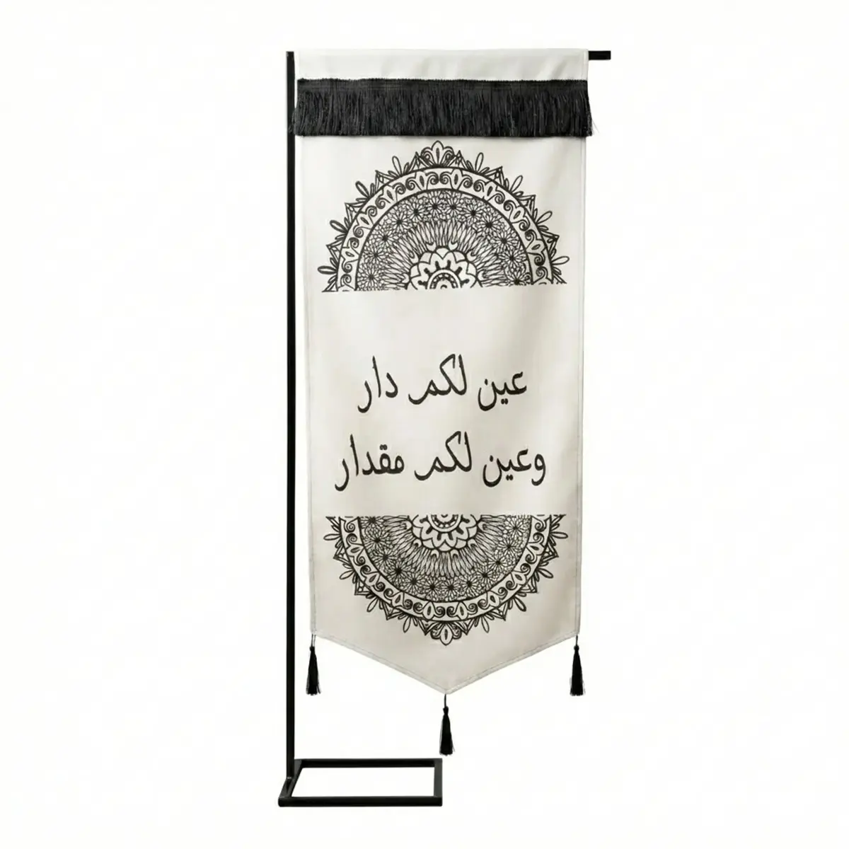 يتميز التصميم بقماش كريمي عالي الجودة، مطبوع عليه زخارف "ماندالا" هندسية دقيقة (Mandala Patterns) باللون الأسود الغني في الجزأين العلوي والسفلي، مما يبرز جمال الخط العربي في المنتصف. تكتمل أناقة القطعة بلمسات "الفرنشة" السوداء الكثيفة في الأعلى، والشرابات (الدلايات) السوداء المنسدلة من الأسفل، لتمنحك قطعة ديكور متكاملة الجمال.