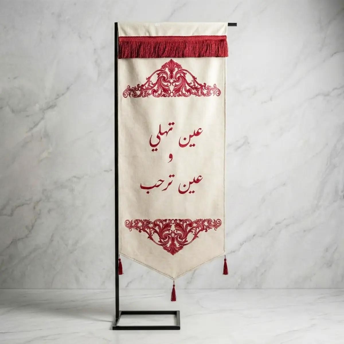 يجمع التصميم بين نعومة القماش البيج الكريمي وفخامة الزخارف النباتية الكلاسيكية (Baroque Style) المطرزة أو المطبوعة باللون العنابي الغني في الجزأين العلوي والسفلي. تتوسط الاستاند عبارة الترحيب بخط عربي انسيابي جذاب، وتتوج اللوحة بـ "فرنشة" عنابية كثيفة في الأعلى، مع شرابات (دلايات) عنابية تتدلى من الأسفل، لتكتمل أناقة المشهد.